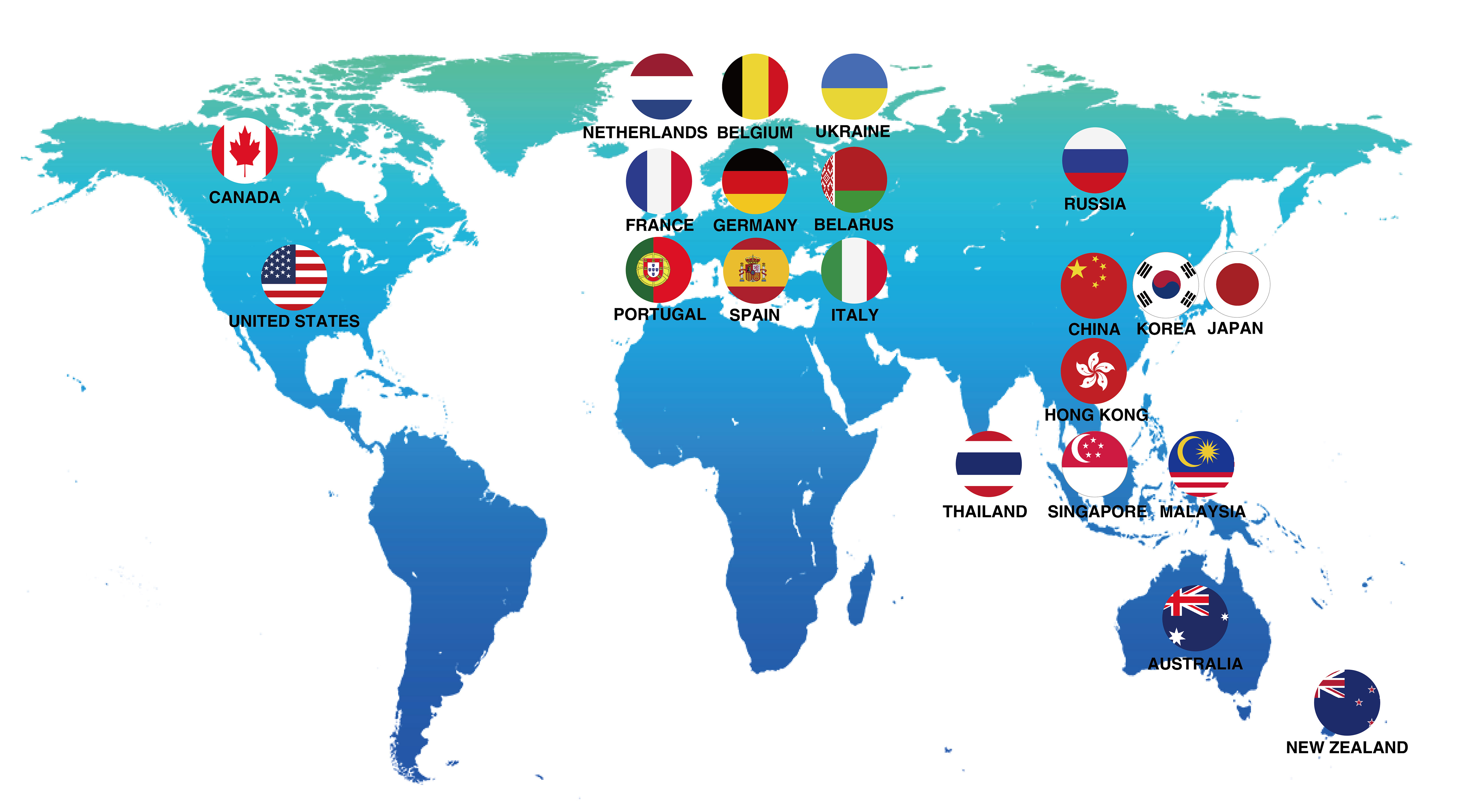 俄羅斯、日本、美國(guó)、比利時(shí)、泰國(guó)、德國(guó)、西班牙、英國(guó)、法國(guó)、加拿大、澳大利亞、新西蘭、馬來西亞、荷蘭、意大利、墨西哥、烏克蘭、新加坡 韓國(guó)、菲律賓